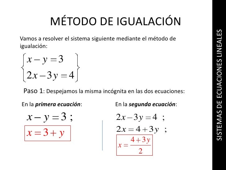 12. Método de igualación: Hay que despejar una misma incógnita en ambas ecuaciones, luego igualamos y resolvemos para obtener la primera incógnita, con este valor sustituimos en cualquiera de las ecuaciones y hallamos la segunda incógnita.